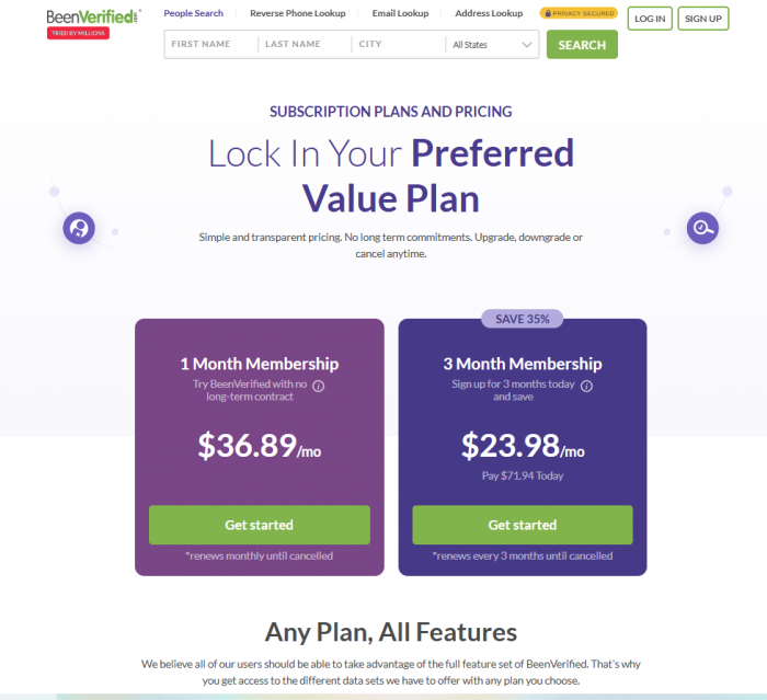 BeenVerified uses subscription-based pricing, with common plans around 26–37 USD per month for unlimited searches and discounted rates of roughly 17–18 USD per month on three‑month commitments.