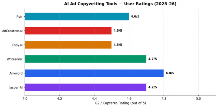 The radar chart below compares the four major tools across six critical dimensions for ad copywriting: output quality, predictive analytics, ease of use, pricing value, brand voice accuracy, and template variety. Each dimension is scored out of 10.