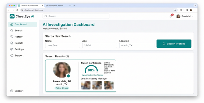 CheatEye AI is probably the most direct alternative to CheaterBuster AI on this list. It does roughly the same thing — Tinder profile search using name, age, and location — but it launched in 2023 with a cleaner interface, a more modern AI matching algorithm, and a pricing structure that makes it far more accessible for people who need more than one search.