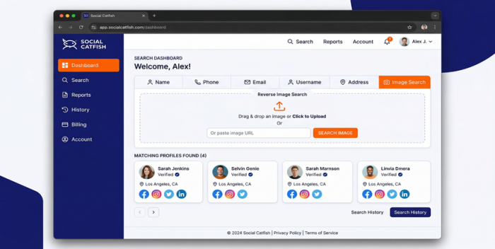Social Catfish is a significantly more versatile tool than CheaterBuster. While CheaterBuster limits itself to Tinder, Social Catfish scans across social media, dating apps, and public records simultaneously. Its standout feature is the reverse image search — upload a photo and it scans the web, social networks, and dating platforms for any profile using that image.