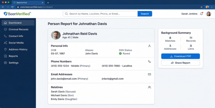 BeenVerified takes a fundamentally different angle compared to CheaterBuster. Rather than hunting for active dating profiles, it pulls together a full digital footprint of a person — criminal records, address history, known relatives, linked social media accounts, contact details, and more. Think of it less as a "is my partner on Tinder?" tool and more as a "who is this person really?" tool.