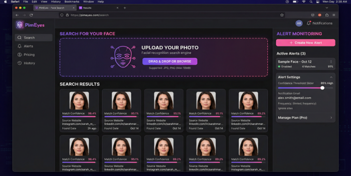 PimEyes — Facial recognition search interface with match confidence scores and alert monitoring panel