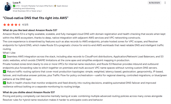 Amazon Route 53 reflecting strong reliability, scalability, and AWS integration but sometimes noted for complexity in pricing/UI.