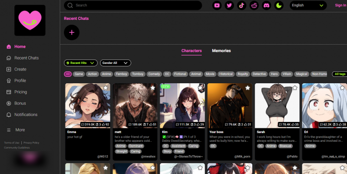 ● Strong roleplay focus with personalities, tags, and “game” or scenario‑style chats that many users find immersive.