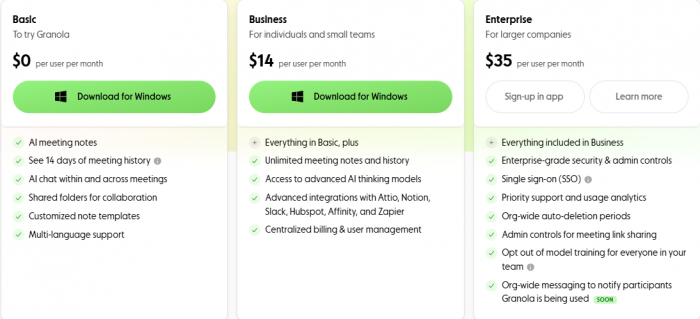 Includes AI meeting notes, 14-day history, shared folders, custom templates, and multi-language support. Perfect for individuals trying Granola.