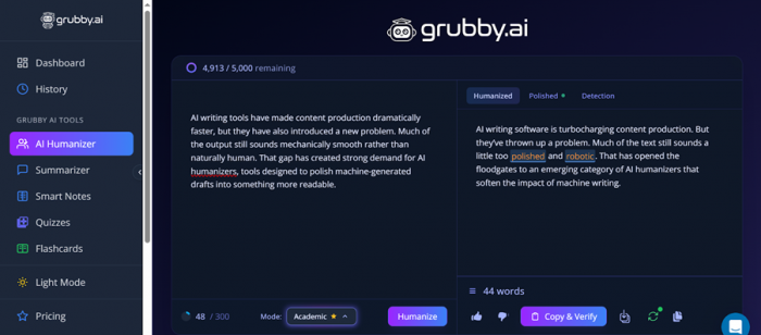 Grubby AI is a browser-based AI text humanizer whose main job is rewriting AI-generated content to sound more natural. It does not create original articles or essays. Instead, it restructures existing text.