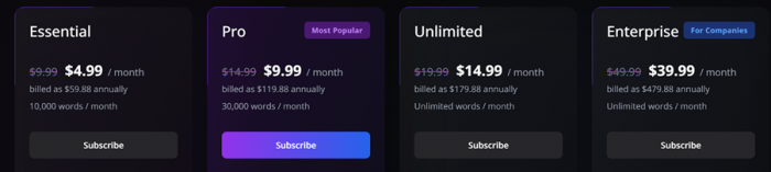 | Pro | $9.99 | 30,000 words per month | billed annually |