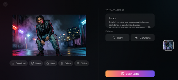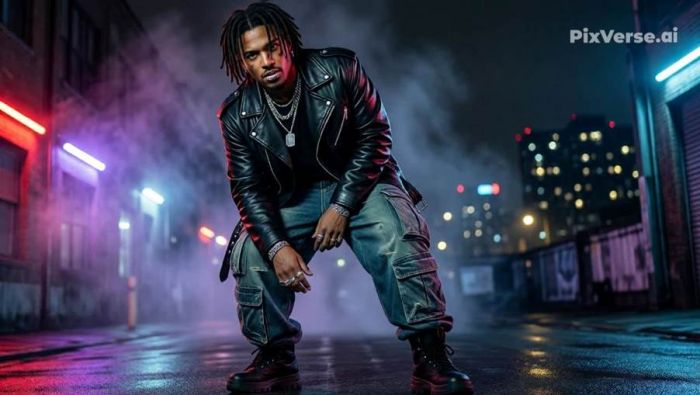 The output was genuinely impressive. The low-angle perspective created that dominant, album-cover style presence. Lighting behaved exactly as described, with neon reflections and strong contrast adding depth. Even smaller details like chains, outfit textures, and shadows were rendered cleanly.