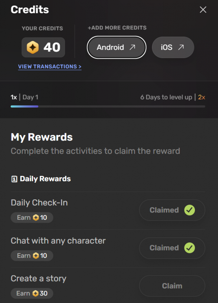 Wsup AI uses a gamified structure where users earn in-app rewards through daily check-ins, chat activity, streak milestones, and content creation actions such as creating stories or characters. These earned rewards appear to unlock additional usage or features, rather than charging a fixed monthly subscription for unlimited access. This positions it closer to a mobile gaming economy than a traditional SaaS pricing tier.