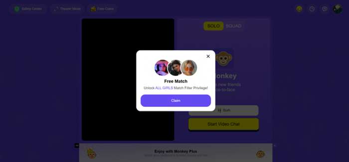 The first thing that appears is not a chat. It is an offer. A “free girls match filter” claim that leads into a reward-based system. Clicking “claim” triggers an advertisement with a countdown timer, after which a one-minute privilege is granted.