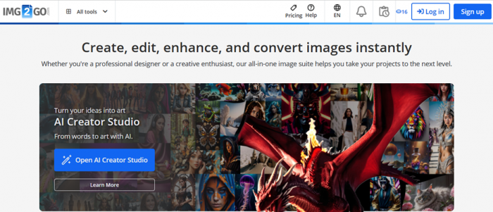 At its core, Img2Go is an all-in-one online image editor, converter, and AI-powered visual tool that runs entirely in your browser. You do not need to install any software to use it. Users can upload images from their device or cloud storage and then perform a wide range of tasks, such as editing, compressing, converting between formats, and enhancing images with AI features.