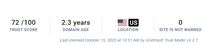 ● Gridinsoft reputation check gave it a moderate trust score (~72/100), indicating the site appears legitimate but should still be verified before use. (Gridinsoft LLC)