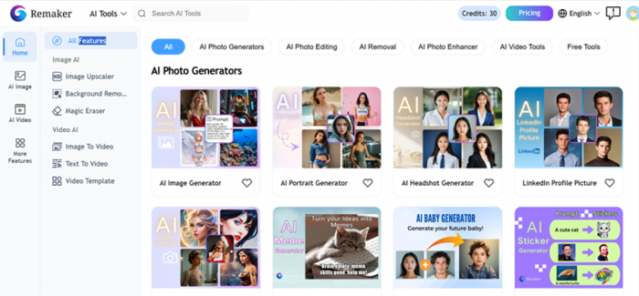 Remaker AI provides 30 free credits on signup, which is enough to test multiple features.