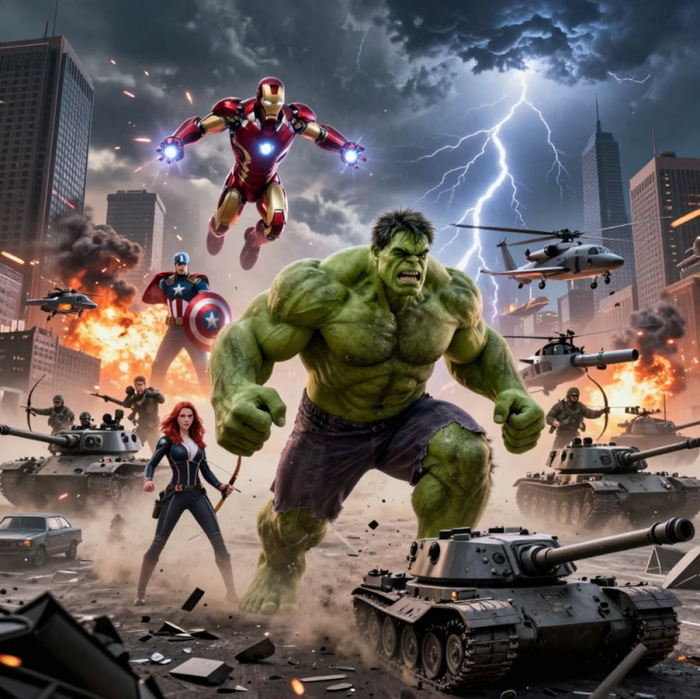 The prompt clearly stated Hulk standing against the Avengers.