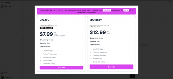 Skipit markets itself as an AI video and content summarizer that can process YouTube videos, PDFs, articles, and websites, then allow conversational Q&A on top of that content. The messaging focuses heavily on productivity themes such as “watch less, learn more,” instant summaries, and unlimited chat capability.