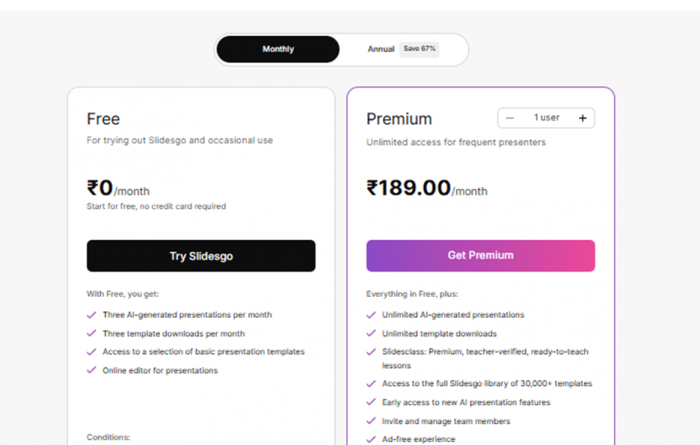Slidesgo follows a freemium pricing model with options suited for casual and frequent users alike: