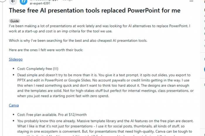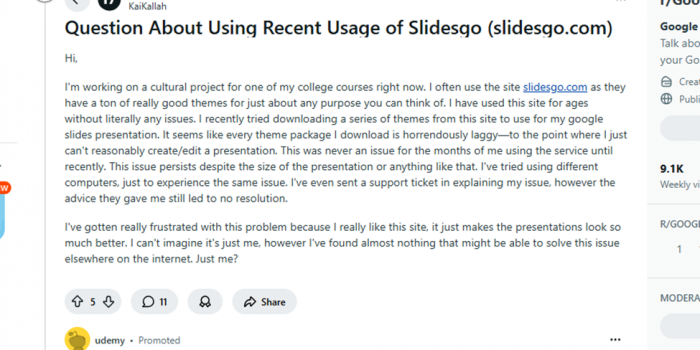 On community forums like Reddit, users have repeatedly cited Slidesgo as a go-to solution for quick, attractive presentations during crunch times where no paid tools are available.