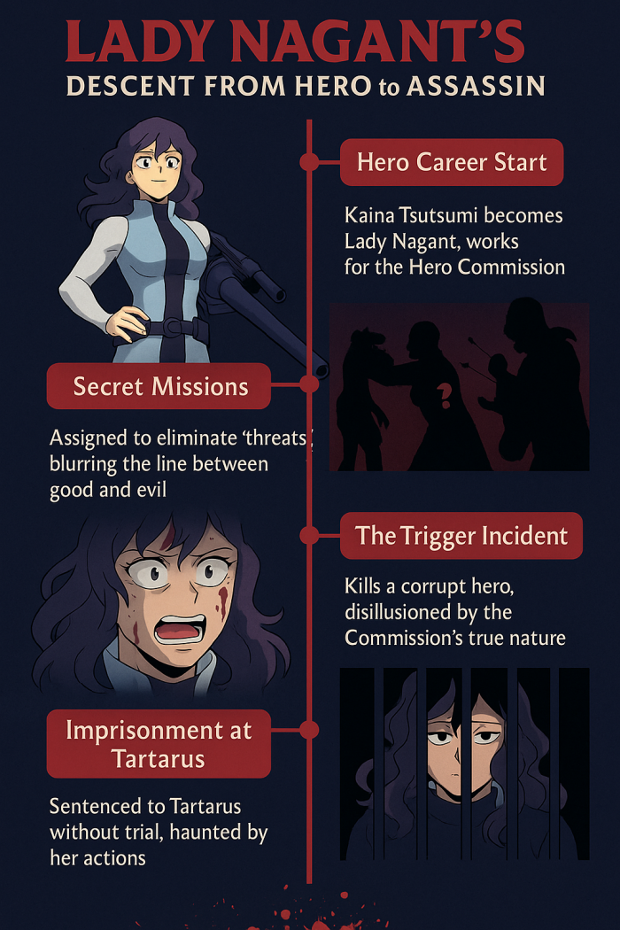Kaina Tsutsumi—later known as Lady Nagant—was the Commission’s secret answer to threats the public must never see. Her missions blurred the line between prevention and persecution. When “peace” demanded pre-crime executions and silencing insiders, her belief in heroism cracked. Pulling the trigger on a corrupt hero didn’t earn praise; it earned a cell in Tartarus.