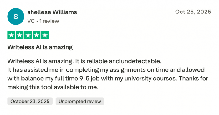 A consistent theme among five-star reviews is that Writeless helps users manage time pressures and handle repetitive academic tasks. Several students describe it as fast, accurate for common topics, and useful for structuring essays or generating references.