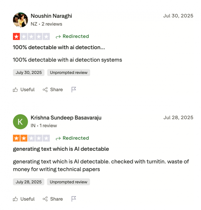Multiple one-star reviews mention that Writeless outputs were flagged by AI detection systems — in some cases scoring as high as 64% AI-generated. These firsthand accounts contradict the product’s undetectability claim and align with the inconsistency highlighted earlier in the performance audit.