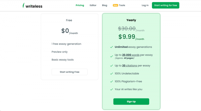 Writeless keeps its pricing simple. The free plan gives users a single sample generation meant solely for testing. The paid tier, billed annually at a low monthly rate, unlocks unlimited text generation and the full word-count capacity.
