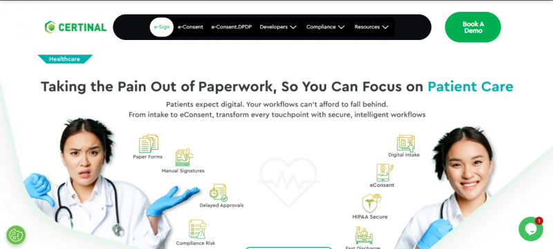 Certinal provides electronic signature capabilities for automating document workflows across enterprises. The platform enables users to add signature fields to forms, documents, and application interfaces, with support for multiple signing methods including in-person, SMS, and email. It integrates with enterprise systems like Salesforce, HIS, EMR, and CRM platforms through REST APIs. The solution includes AI-powered features for contract analysis, automated document generation based on user behavior, and comprehensive audit trails. Certinal emphasizes compliance across 80+ countries and supports multilingual signing, making it applicable to healthcare, business process automation, and consent management workflows.