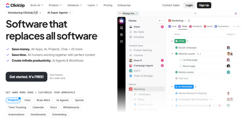 ClickUp provides a customizable platform to organize tasks, Docs, Chat, and AI tools in one Workspace. It uses a unique Hierarchy to structure work from small teams to enterprises, with Everything view to find items across levels. Users break projects into subtasks and checklists, apply 35+ ClickApps for task functions, and automate processes with 50+ actions. Templates cover use cases for views, tasks, and Docs. Relationships link tasks, documents, and integrations. Collaboration occurs via real-time comments, Whiteboards, email integration, and Docs. Dashboards aggregate project indicators with visual widgets.