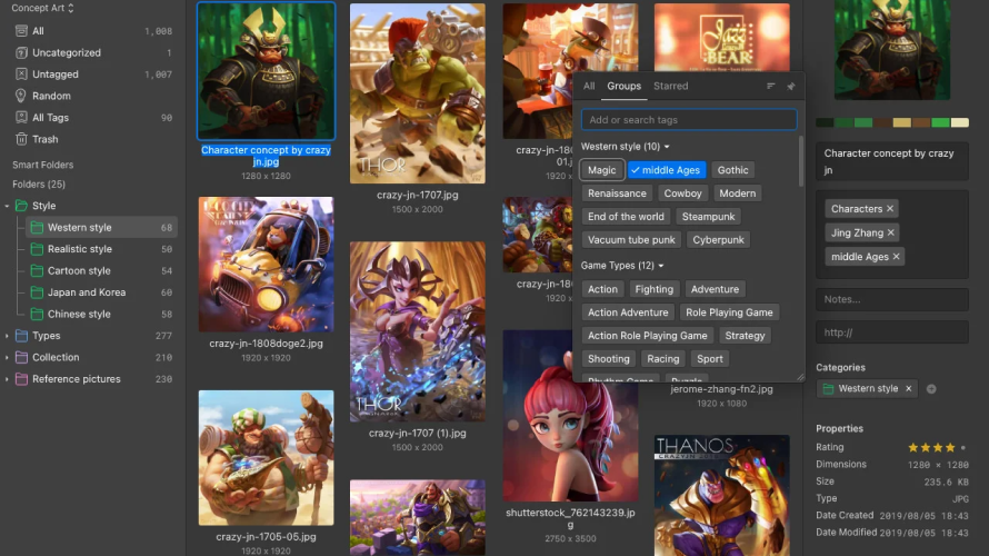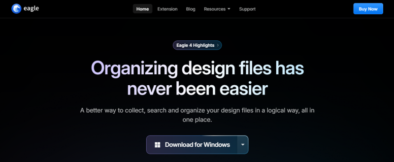 Eagle organizes thousands of images and hundreds of categories. It enables swift location of assets through advanced filters and searches in under 0.5 seconds. Core functions include keyword search, color search, image-based search, and multi-dimensional filters. Users browse assets with scaled display, hover previews, and spacebar previews for images, GIFs, videos, and audio. Eagle 5.0 adds AI Search for finding by reference images locally, AI Action for auto-naming, auto-tagging, and auto-sorting files, and Eagle MCP for executing complex requests via natural language. All processing stays on the user's machine with no cloud uploads required. Lifetime license owners receive free upgrades.