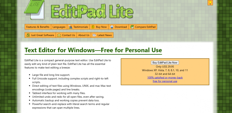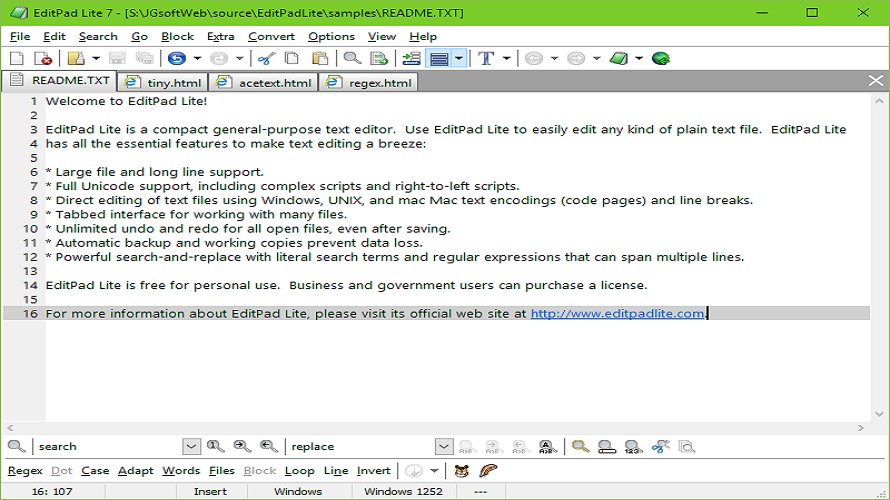 EditPad Lite is a high-performance, compact text editor for Windows, designed to replace Notepad and facilitate professional-level plain text and code editing tasks. It balances speed, user-friendliness, and deep functionality making it the go-to choice for users needing to handle large files, automate editing, and maintain smooth workflows.