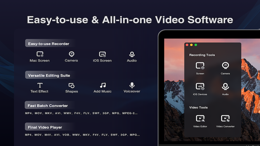 Filmage Screen is a unified video software that combines screen recording, audio capture, video editing, format conversion, and media management in a single application. It enables users to record HD video at up to 4K resolution with system audio and microphone input, mirror iOS devices to Mac for simultaneous recording, and edit captured content directly within the same tool. The software supports multiple capture modesull screen, target window, or custom areas nd exports videos without watermarks across various formats including MP4, MOV, MKV, AVI, and WMV. No recording time limits apply, and users can schedule recordings in advance with automatic start and stop functionality.