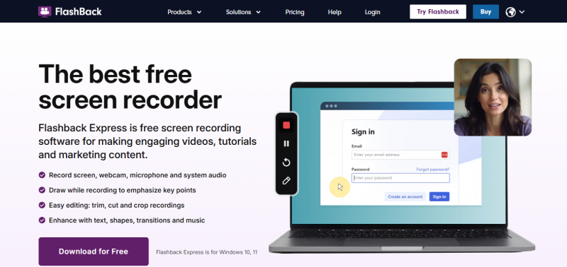 FlashBack Pro captures any part of the PC screen and turns it into a video file. It records screen and PC sounds, webcam and microphone, with no time limits or watermarks. Users edit video and audio frame-by-frame, crop movies to follow the mouse, join movies together, and smooth jerky cursor movements. Annotations include text, images, sound, picture-in-picture video, and highlights. Effects cover zoom, magnifier, and transitions. Movies export as MP4, AVI, WMV, GIF, or standalone EXE, with options to upload to YouTube or password protect.