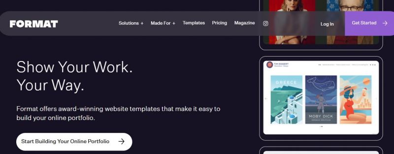 Format is a website building platform optimized for creative professionals (photographers, artists, designers) that focuses on visually showcasing portfolios, work galleries, and integrated business tools (like client proofing, e-commerce) in a clean, image-forward interface.