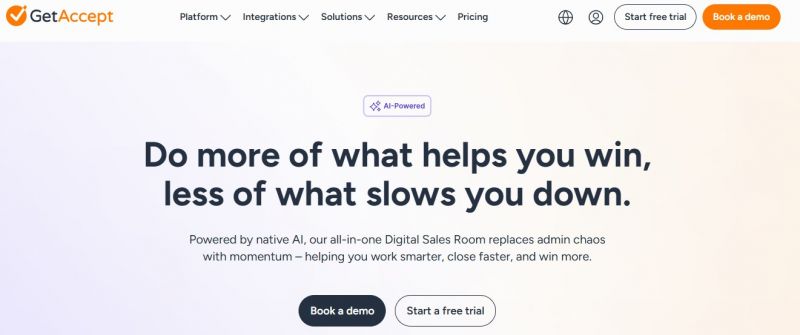 GetAccept creates a shared online space (Digital Sales Room) where sellers and buyers can interact through proposals, videos, documents, and conversations. It integrates with CRM systems so sales reps can manage deal documents and track buyer engagement without switching platforms. Built‑in AI helps generate tailored content and summarize meetings to maintain momentum and close deals more efficiently.