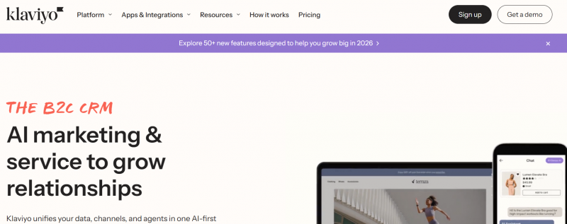 Klaviyo unifies data, channels, and agents in one AI-first platform. It combines marketing automation, analytics, customer service, and data management to handle customer interactions across email, SMS, WhatsApp, and more. AI tools predict customer behavior, generate segments from prompts, and power features like subject lines and product recommendations. Customer Hub provides self-service order tracking and AI chatbots, while analytics offer benchmarks and performance metrics across channels.