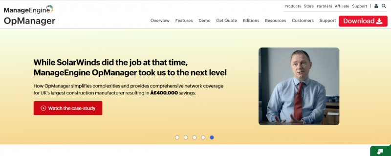 ManageEngine OpManager monitors network performance with over 2000 metrics, intuitive dashboards, instant alerts, and intelligent reporting. It tracks routers, switches, firewalls, servers, and other devices for health, availability, and performance issues. Core focus includes real-time monitoring of WAN links, VoIP quality, server resources, and bandwidth usage. Differentiation comes from automatic L1/L2 mapping, root cause analysis, adaptive thresholds using ML for forecasting, and workflow automation for fault resolution. It supports physical, virtual, and distributed environments from a single console.