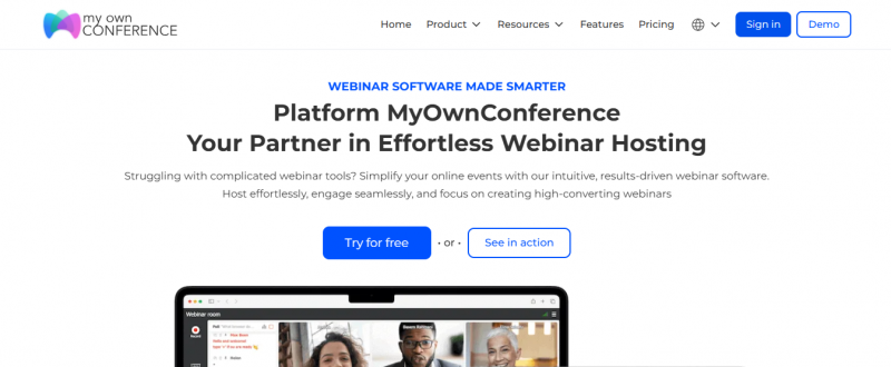 MyOwnConference is a web-based webinar and conferencing platform that enables users to host live online events from any device without requiring downloads. The platform emphasizes simplicity and reliability, offering features for managing multiple concurrent sessions, scheduling, and audience engagement. It supports events ranging from free webinars to paid sessions and can accommodate up to 10,000 attendees. The platform operates with 99.98–99.99% uptime and provides tools for content sharing, interactive participation, and post-event recording.