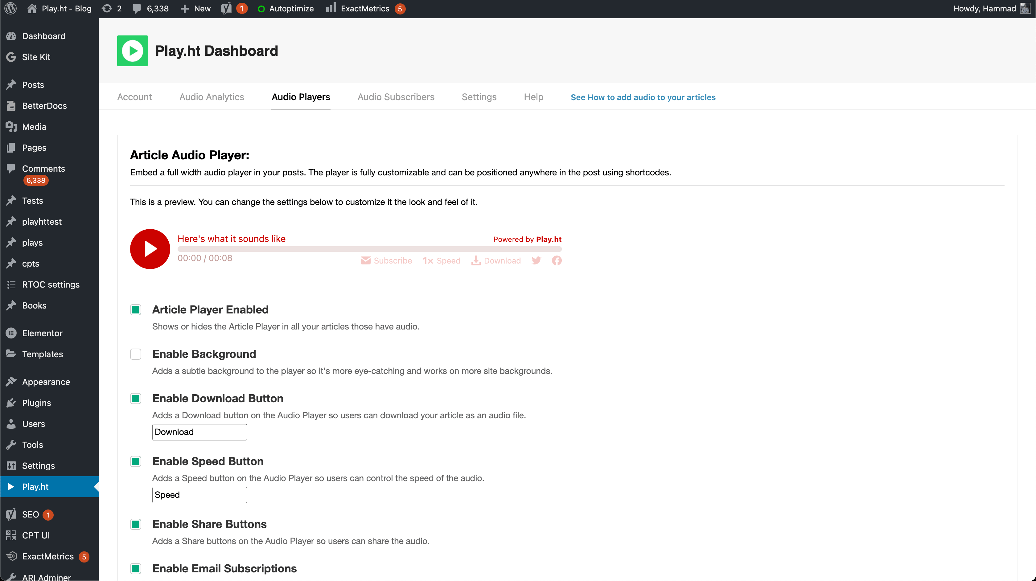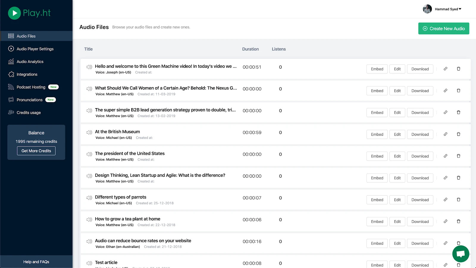 Embeddable Audio / Audio Storage | You can host generated audio in Play.ht cloud, and embed players in your website so visitors can listen to content (e.g. blog posts). | Storage, bandwidth or embed customizations may depend on plan. Also, if many visitors play audio, you might hit usage / bandwidth limits. |