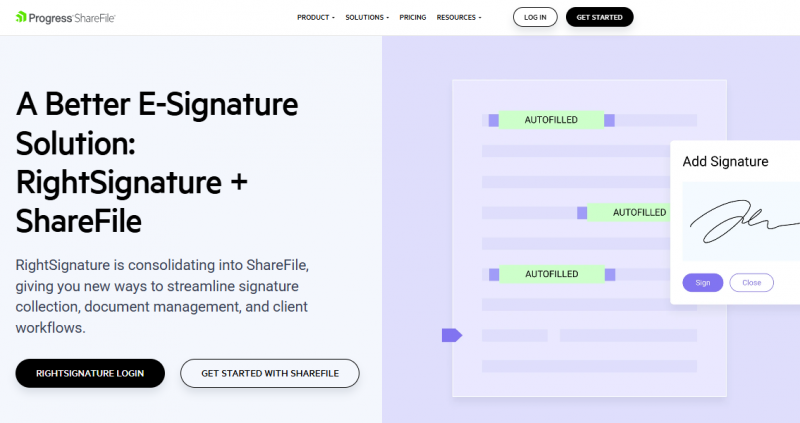 RightSignature enables electronic signatures on documents through plans that include envelope limits and compliance features. It focuses on workflows for sending documents for signing, with options for basic templates and mobile access in entry-level tiers. Higher plans add team collaboration, reminders, sequential signing, custom branding, and integration with ShareFile for secure file handling. Pricing starts at around $10 per user per month for Essentials, scaling to $20 for Professional and custom Enterprise, often bundled with ShareFile storage and sharing.