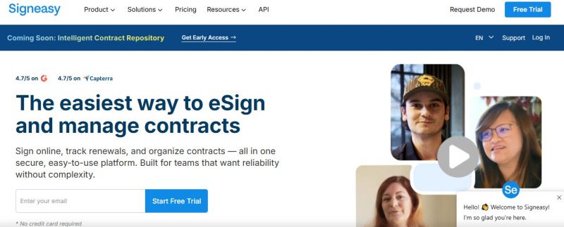 SignEasy enables sending, signing, and managing contracts online. It removes printing, faxing, and scanning by supporting electronic signatures, signer management, and custom fields across devices. The platform tracks renewals, organizes documents in a repository, and provides reports. Signeasy AI offers contract review, key terms extraction, smart Q&A, and summaries. Users prepare envelopes with templates, fields, and branding; collaborate via template sharing, editing, and signing order; automate through API