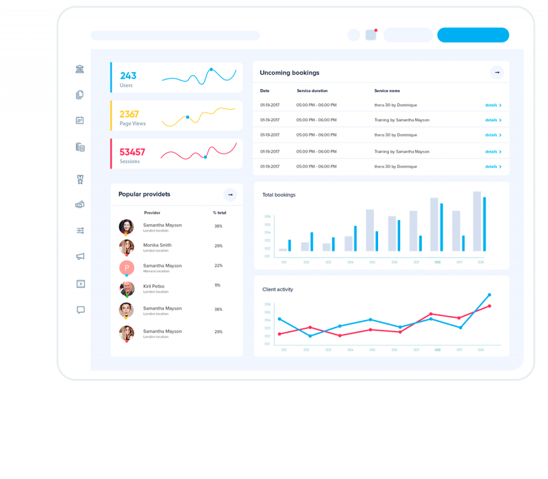 SimplyBook.me provides an online booking system with an admin interface for managing bookings, settings, and design, alongside a booking page for clients to schedule services. Users can add and customize service providers with individual schedules, set up services with unique settings, and manage multiple locations.