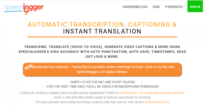 Speechlogger transcribes speech in real time with auto-punctuation, timestamps, and auto-save. It translates voice-to-voice and generates captions for videos, including .srt files from audio files or dictation. Users connect phone audio to computers for captioning calls or transcribing interviews. It supports instant translation for meetings with foreign speakers by displaying translated text on screens. Additional functions include hearing assistance for face-to-face or phone interactions and dictation into website text boxes via a Chrome extension. Speechlogger Live adds broadcasting of live captions and translations for meetings, events, and multiple speakers.