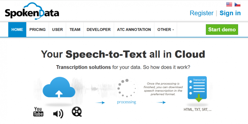SpokenData provides automatic and human transcription for audio and video files. Users upload media files or enter URLs, select processing options such as speech-to-text, voice activity detection, speaker segmentation, or text-to-audio alignment. Processing completes with email notification, followed by access to results in an online transcription editor for editing or downloading in formats like SRT, TXT, or XML. Registration unlocks a personalized media library with tagging and categories. Supported languages include English, French, German, Hindi, Russian, Chinese, Italian, Spanish, Czech, and Slovak. API access enables integration, with customization available for specific domains.