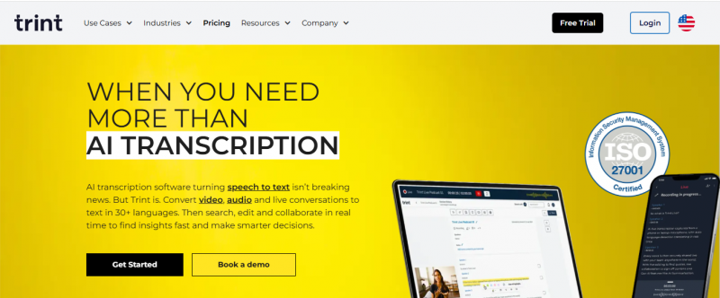 Trint transcribes audio and video files to time-coded text up to 99% accurate with good audio and clear speech. Users upload files in formats like MP3, MP4, M4A, AAC, WMA, AVI, WAV, and MOV, or use live transcription for interviews, speeches, video calls, or microphones. Transcripts support review, editing, searching, and sharing like cloud-based documents, with real-time collaboration, speaker detection, and custom dictionary in 40+ languages. Translation extends to 70+ languages for captions. AI assists by summarizing transcripts, finding quotes, and identifying insights. No one accesses user data except the owner, with ISO 27001 certification and external AI training.