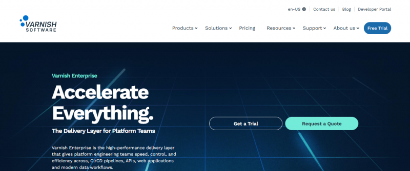 Varnish Enterprise is a programmable caching and delivery layer deployed in front of backend systems to accelerate HTTP traffic, reduce infrastructure strain, and enable fine-grained control over request/response behavior. It functions as a reverse proxy and HTTP engine that handles artifact caching, API offloading, media streaming, and dynamic content delivery across on-premise, cloud, edge, and hybrid environments. The platform supports deployment in Kubernetes-native setups, bare metal, VMs, and private or public clouds, with capabilities including disk-based persistent caching, TLS support, traffic policies, and 45+ VMODs for custom edge logic and routing.