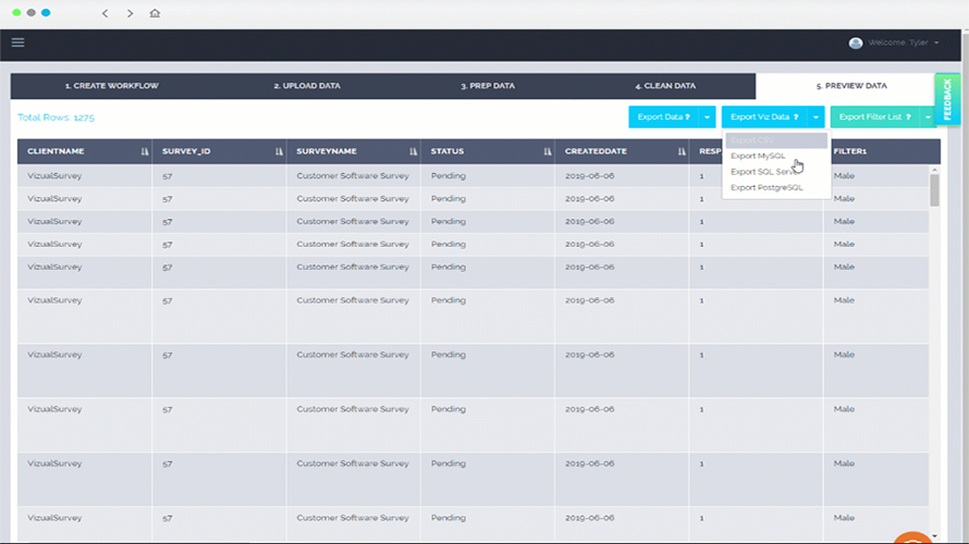 VizualSurvey enables users to transform survey, questionnaire, and product review data into Tableau dashboards and presentations. It automates data cleaning from messy formats across survey software, providing prebuilt templates created by Tableau experts. Users upload data through a self-service app, apply workflows for transformation, and generate interactive, custom-branded dashboards for filtering, segmentation, and exploration. The tool supports same-day results without Tableau experience, integrates third-party data, and exports to PDF or PowerPoint. It streamlines the process from data upload to sharing dynamic reports, replacing manual Excel handling.