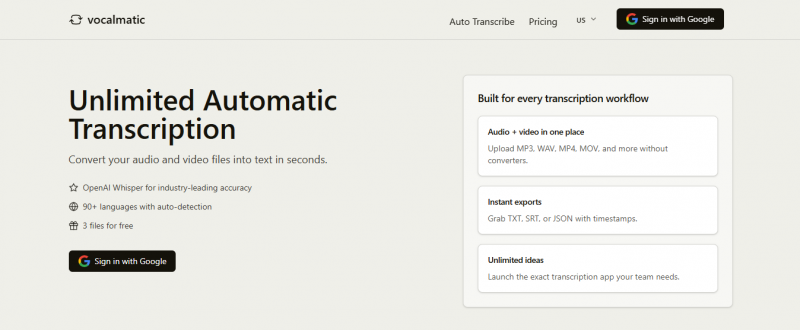 Vocalmatic enables transcription of audio files directly in the browser using AI-powered speech recognition. Processing occurs locally with no uploads, ensuring privacy and no file size limits. Users select audio files or record directly, supporting formats like MP3, WAV, and M4A. The technology converts speech to text quickly, though minor corrections may be needed based on audio quality and accents. Transcripts can be used for personal or commercial purposes. Three free transcripts are available after signup.