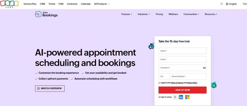 Zoho Bookings provides online appointment scheduling with calendar sync, self-booking pages, and automated reminders. It manages one-on-one services, group events, collective meetings with multiple hosts, and resource bookings like rooms or equipment. Scheduling rules control availability, locations, meeting types, reminders, pricing, and cancellations.